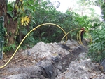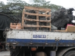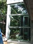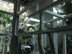 Workers moving pre-fabricated glass block panel suspended from hoist above into place along South facade of Sun Room